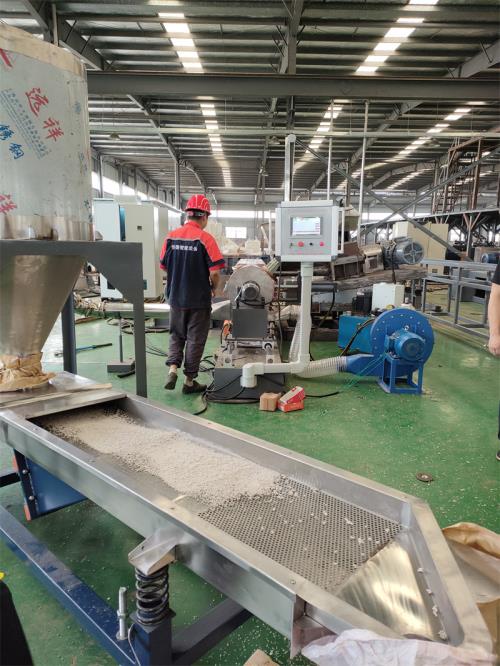 脆性不大于II級;2)螺筒采用水冷卻;筒體上開槽,盤銅管,通冷卻油;螺筒上加防護罩,不銹鋼材質(zhì);3) 加熱區(qū)段:采用優(yōu)質(zhì)鑄鋁加熱器5、水循環(huán)冷卻系統(tǒng)1)水泵泵電機功率:3kw;自動控水電磁閥;手動閥用銅閘閥控制;加大水流量,2)采用環(huán)保風冷卻系統(tǒng)(環(huán)保型:公司發(fā)明專利號:CN201911312134.6)不需要接外循環(huán)水冷卻6、液壓板式自動換網(wǎng)系統(tǒng):與雙螺桿公用1)換網(wǎng)器,板式過濾自動換網(wǎng)器,流量截面為圓形;2)液壓缸、液壓站等一套,采用YA-N46抗磨46#液壓油;(油品需客戶自行采購)7、熱切機頭裝置:1) 熱電偶與壓力傳感器分開安裝,分別用于檢測溫度和壓力(五)水環(huán)模面熱切輔機系統(tǒng)1)水環(huán)模面熱切造粒機:4級電機,功率2.2kw;熱切刀一套、電機聯(lián)軸器一件,“三晶”變頻調(diào)速器器2)水環(huán)切粒罩:臥式,不銹鋼材質(zhì);一件;推拉式結(jié)構(gòu);帶剎車裝置;熱切罩與機頭分離開有足夠空間;操作方便;水環(huán)切粒罩與法郎為一體式;3)水泵一臺,功率3kw;加大型導(dǎo)流槽:不銹鋼材質(zhì),4)離心脫水機:一臺,電機功率11kw,加大型水箱為優(yōu)質(zhì)不銹鋼材質(zhì);5)加長振動篩:一臺,L=2.5m,電機采用:震動專用電機;震動量可以調(diào)節(jié)大小:電機功率率:0.55KW兩臺;振動篩篩網(wǎng)采用三層分離物料;大孔直徑φ8mm,小孔直徑φ2.5mm,不銹鋼材質(zhì),振動篩出廠時;振動量調(diào)節(jié)到最??;6)風吹成品料倉:一套,1m3料倉一件,不銹鋼材質(zhì);采用φ130mm不銹鋼管聯(lián)接;4kw物料輸送風機;管道料造粒機 http://ts212.com/